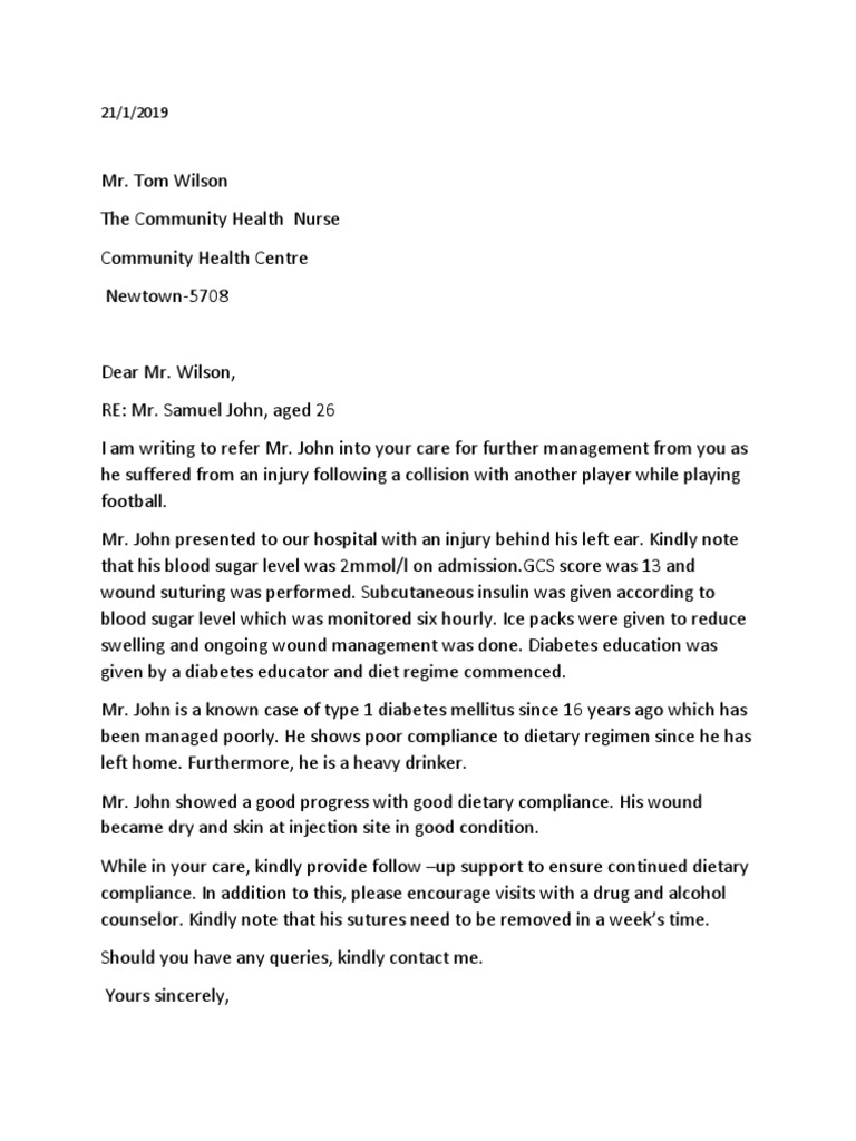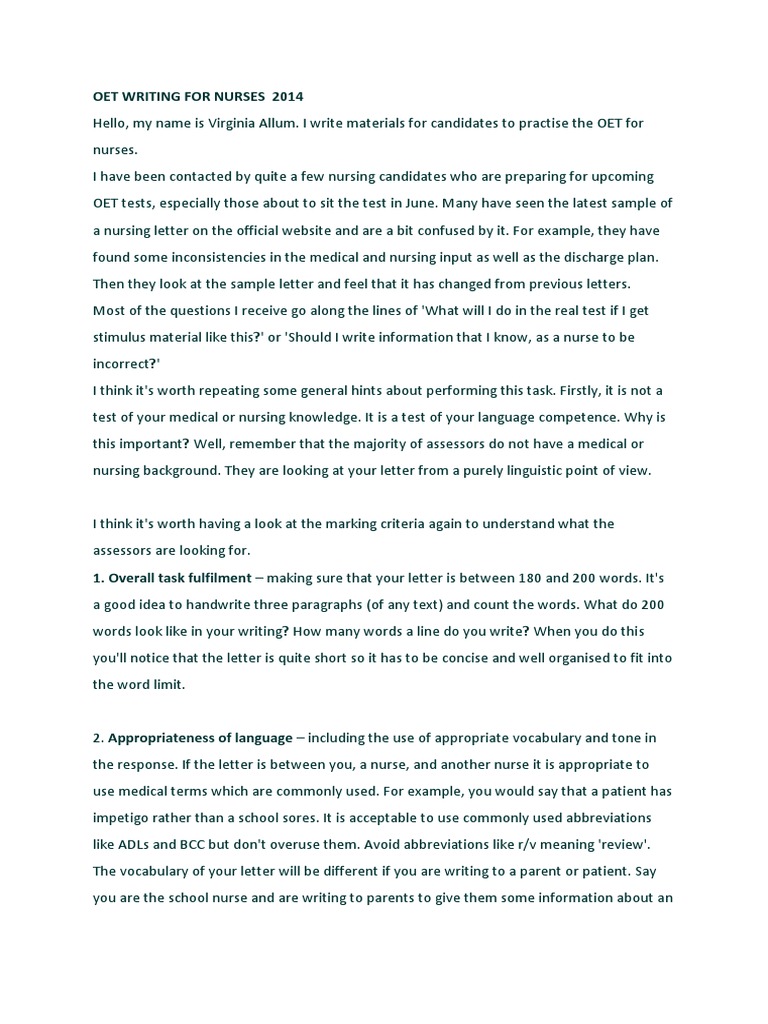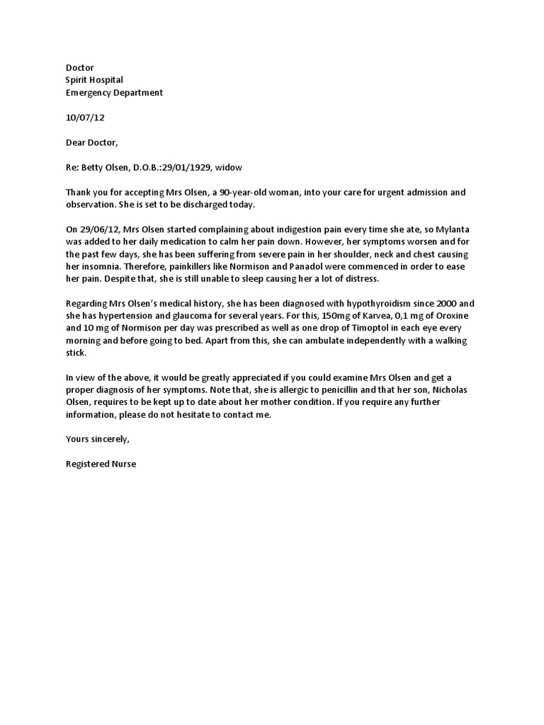 It can be terribly boring. The nurse here has taken good care of articles capitalisation tenses and word choice. There is also a sample letter to use for your OET preparation.
