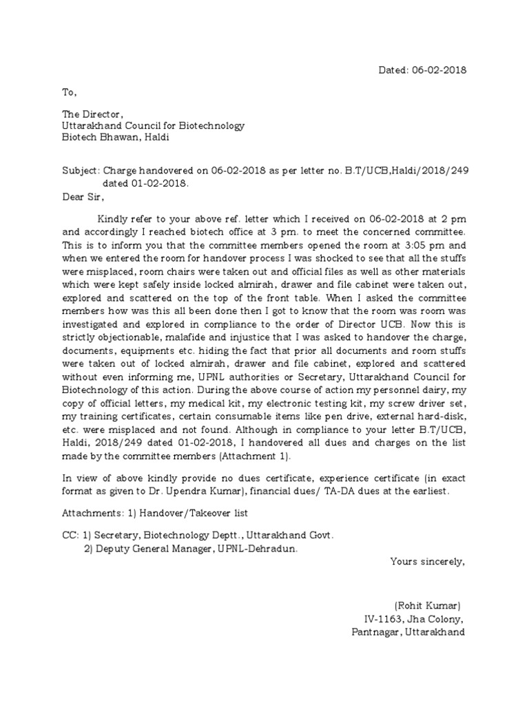 I am handing over the following documents assets to you with effect from date. Keys I assure that the above is in order. Responsibilities Handover Sample Letter Format.
