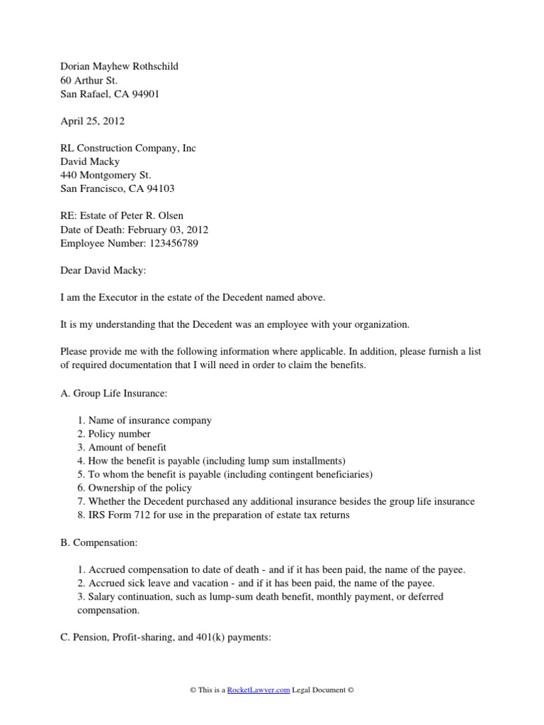 Employee Death Benefits Letter Template. Here by inform you about the death of my. Death Claim Letter of.
